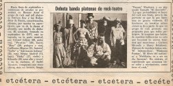 En la otra había una perlita. En un rinconcito, allá abajo, en una sección titulada «etcétera» se veía una foto de gente rara disfrazada debajo del título: «debuta banda platense de rock-teatro«.